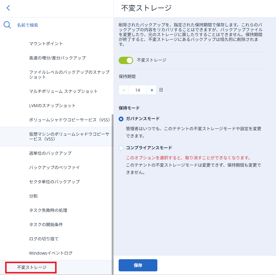 クラウドバックアップにおいて、不変ストレージ という機能が実装されました。